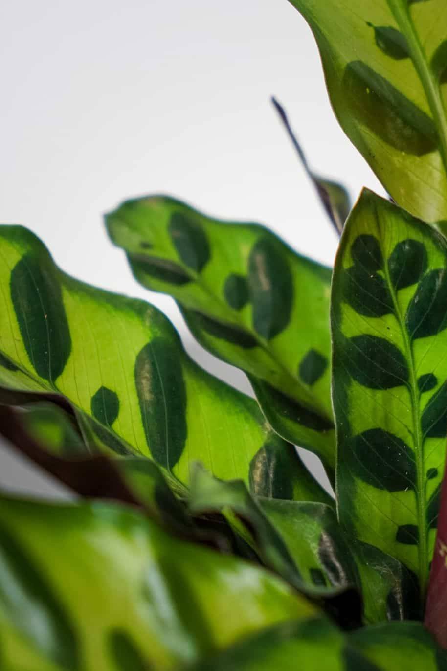 This member of the Marantaceae family is called Rattlesnake Plant for its striking patterns. Long and narrow, the leaves have ruffled edges that are unique to this Calathea species. They are bright green with alternating dark-green markings down each leaf. The underside of the leaves are purple. Of course, they also fold up at night just like prayer plants.