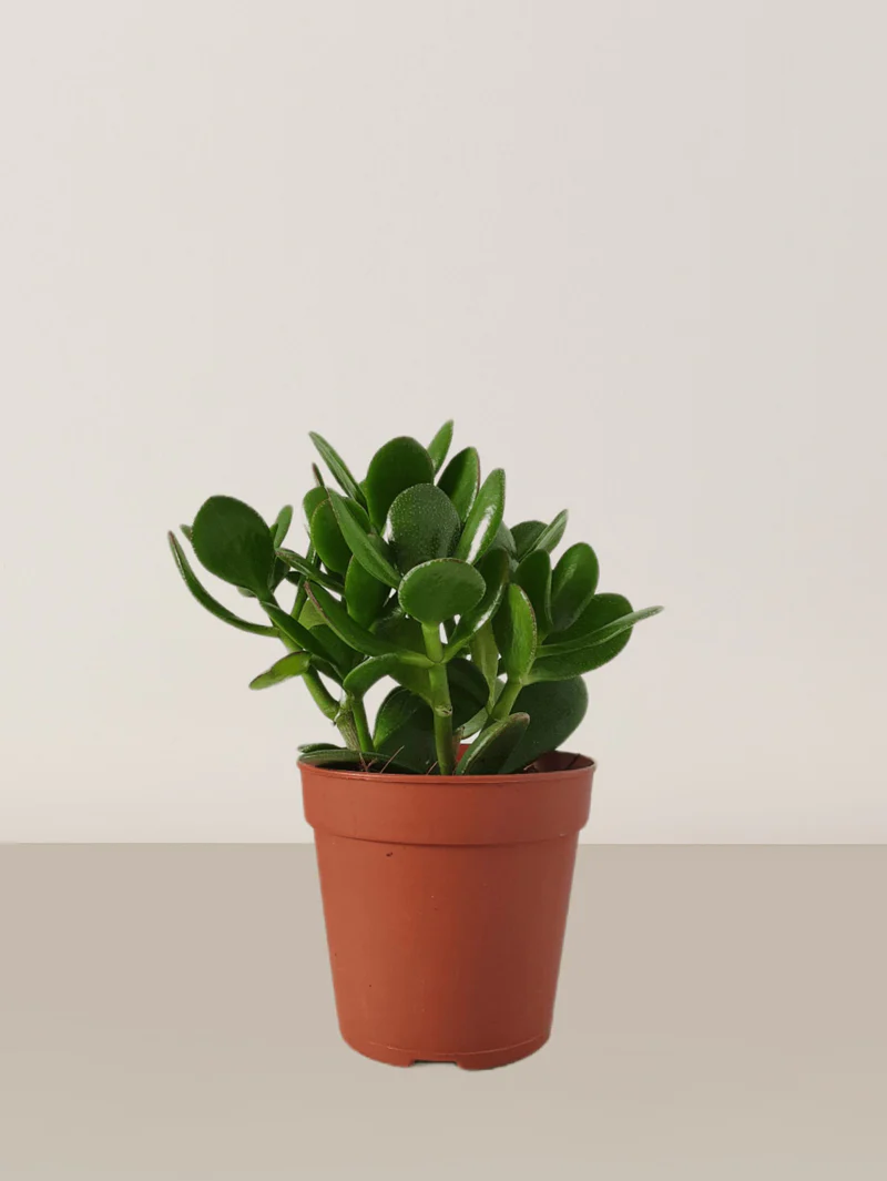The Jade Plant, also known as Crassula Ovata, is a popular succulent native to South Africa. It is a small, slow-growing plant that can reach up to 20cm in height and 30cm in width. The plant has thick, fleshy leaves that are oval-shaped and glossy, with a dark green color that can sometimes have a reddish tint. The leaves are arranged in pairs along the stem, and they can grow up to 5cm long.