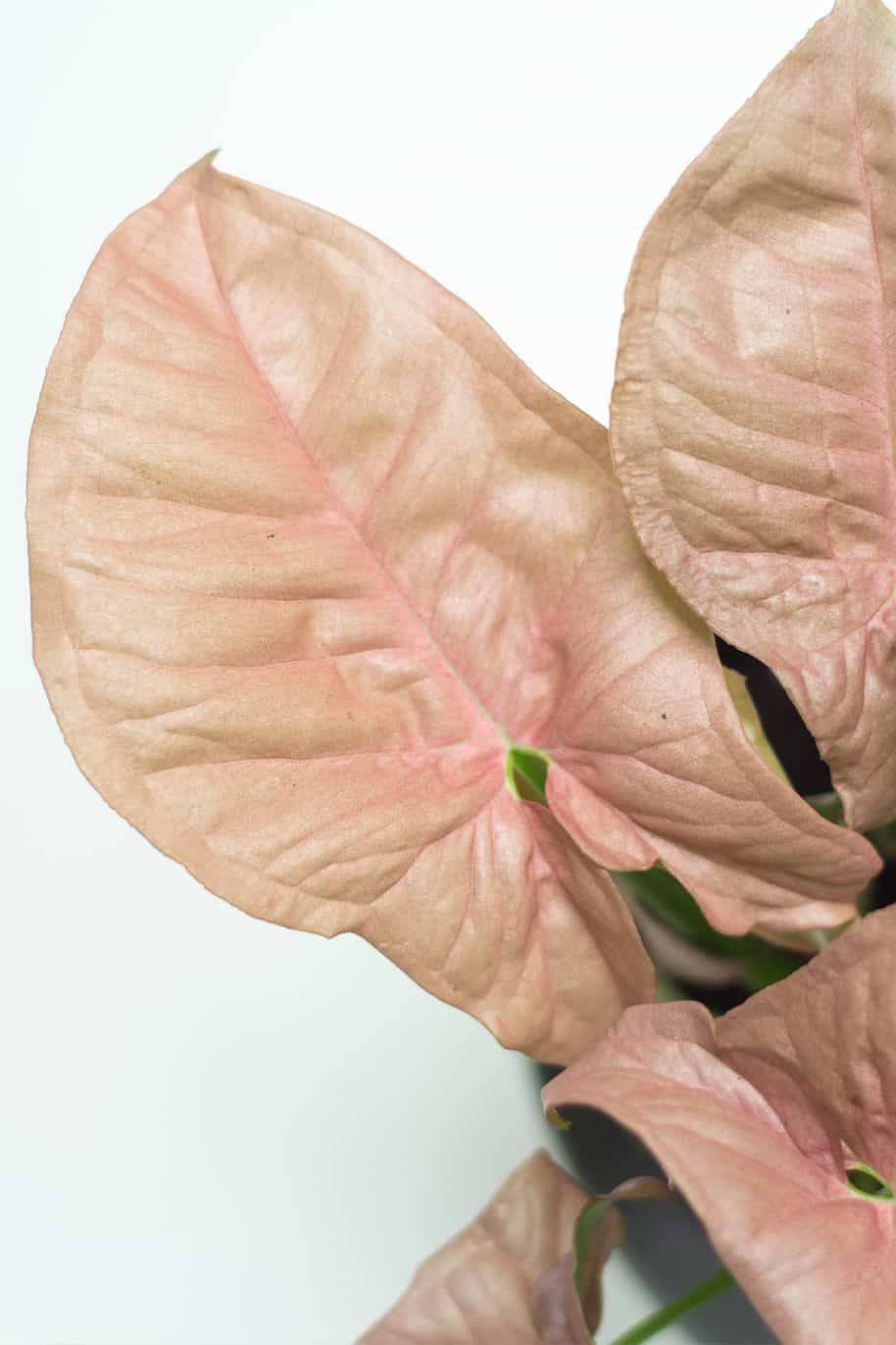 This plant has a common name Arrowhead Vine, the pink variegation has gorgeous salmon-colored leaves and lush shape.